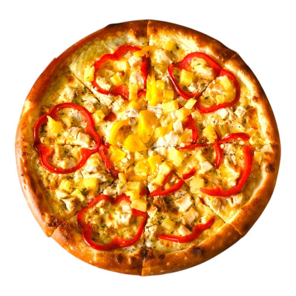 Сливочный соус, сыр Mozzarella, нежная курочка, ананас, болгарский перец.