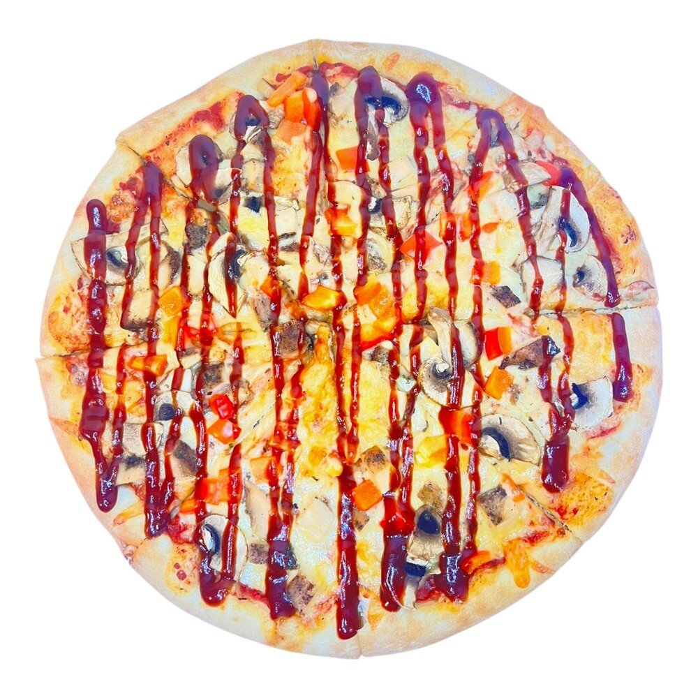 Фирменный томатный соус, сыр Mozzarella, нежное куриное филе, болгарский перец, грибы и вкусный соус барбекю.