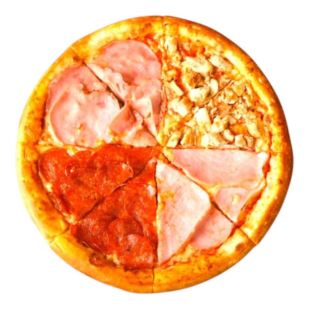 Карбонад, ветчина, пряный пепперони и нежный цыплёнок с сыром Mozzarella под фирменный томатный соус и все это одной пицце.
