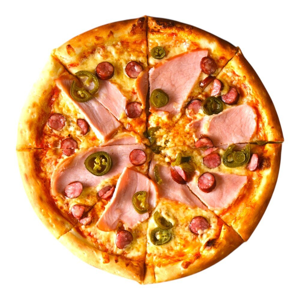Фирменный томатный соус, сыр Mozzarella , охотничьи колбаски и карбонад с болгарским перцем халапенья.