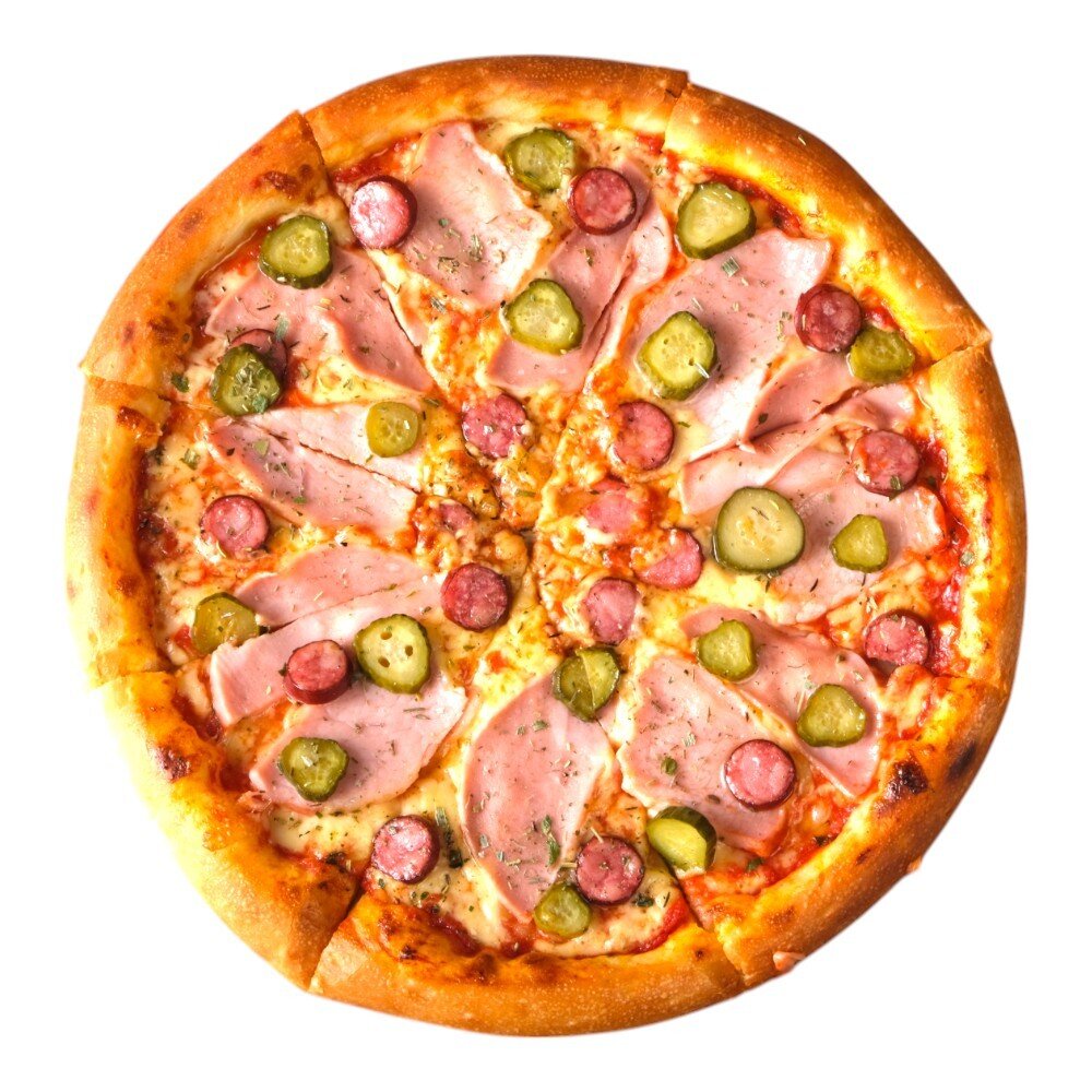 Фирменный томатный соус, сыр Mozzarella, идеальное сочетание мясных вкусов карбонада, ветчины и охотничьих колбасок, украшенное маринованными огурчиками.
